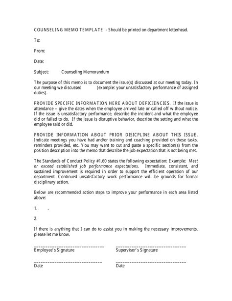 Counseling Memo Template . Look at the bottom of this page for two possible templates of counseling memos. The memo confirms a meeting date, lists the.